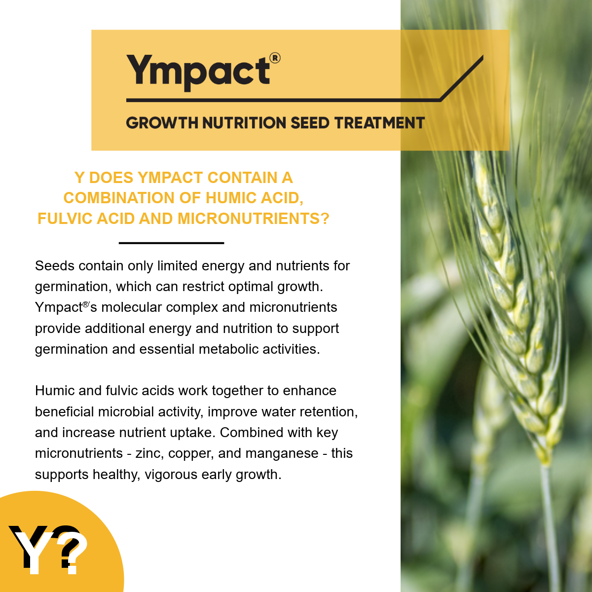 By enhancing germination, early vigour, and stress tolerance, Ympact® helps plants establish stronger and grow more resiliently. With humic and fulvic acids plus key micronutrients like zinc, manganese, and copper, Ympact® supports root development and boosts yield — proven in trials to deliver up to 5.1% yield gains when used alongside fungicide seed treatments.